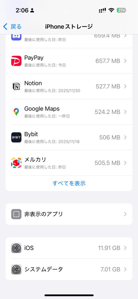 数分で終わる基本の容量確保法です。これだけで数GB空くこともあります。