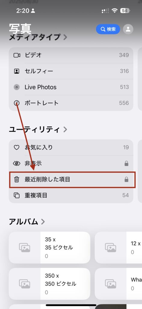 「写真を削除した」と思っていても、iPhoneは親切心で「30日間」はゴミ箱に保管してくれています。これが容量を圧迫している最大の原因なことも多いです。