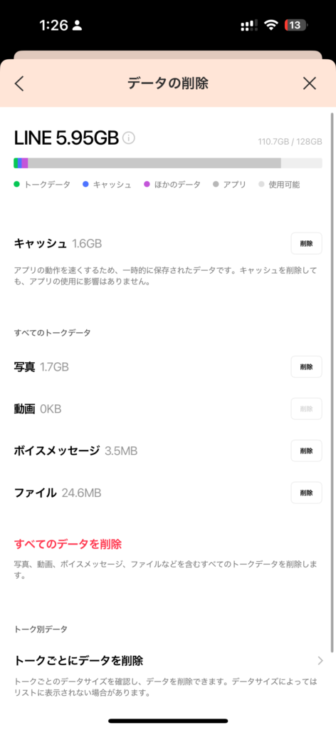 というのも、トークルームで送られてきた写真や動画の「一時データ」が裏側で溜まり続けているからなんです