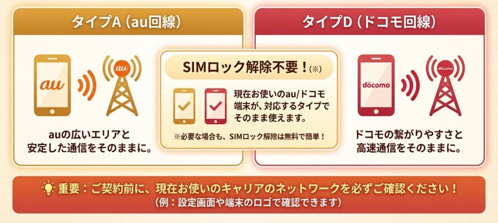 手持ちのスマホがau系ならタイプA、ドコモ系ならタイプDを選ぶことで、SIMロック解除なしで利用できます。